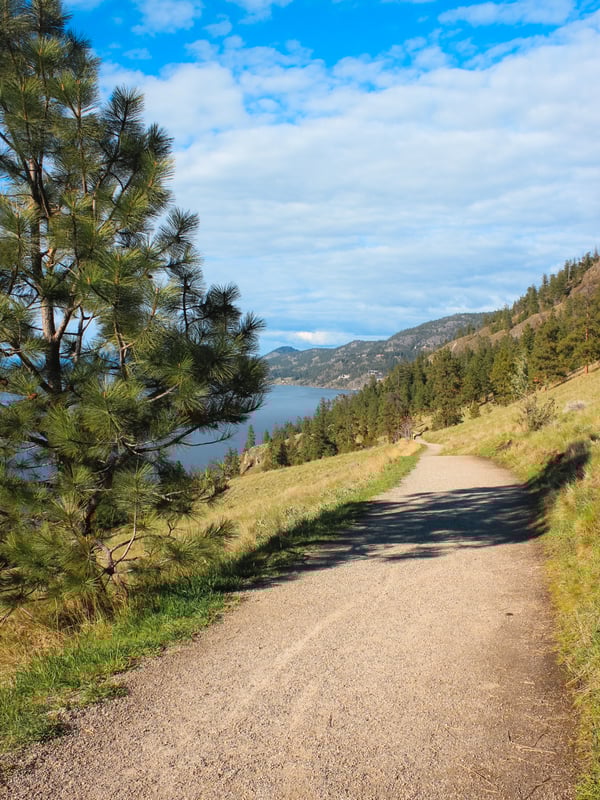 The trail is easy, perfectly maintained, and wonderful no matter the season — although it’s best in the spring and fall. You’ll hike along the base of Knox Mountain, all the while enjoying stunning views of Okanagan Lake. I have a soft spot for all hikes with views of the lake. It’s just so damn pretty!