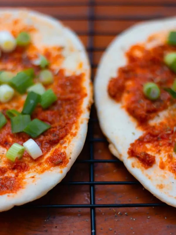 Next, spread a layer of sun-dried tomato tapenade (this gives the sauce more flavour than regular pizza sauce) and sprinkle the nann with pepper, oregano, and salt. Then, add the basil and onions to the naan.
