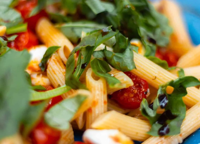 This camping Caprese pasta salad is based on the simple Caprese salad — tomatoes, mozzarella, and basil plus a few extra ingredients.