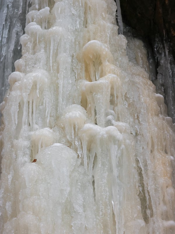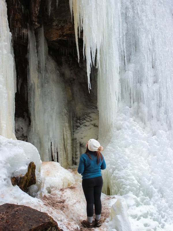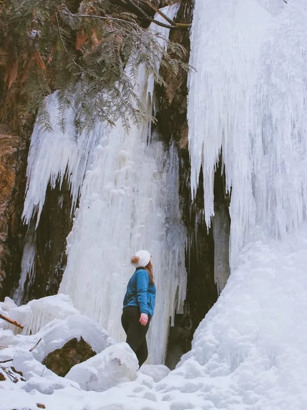 In the winter, the waterfall completely freezes and is quite impressive; you can walk in and behind the waterfall! Bring spikes so you can head downhill and see an even more impressive view of the waterfall.