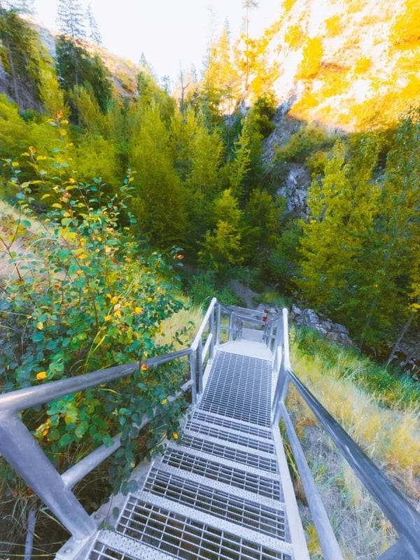 You’ll hike through a tunnel of trees that’s covered in rocks — this is the hardest part of the trail to the lower falls. After that the trail is a lot clearer, winding over a small trickle of water, across a grassy hillside, and down a metal staircase. You’ll continue to descend, eventually meeting up with Bellevue Creek. Once you’ve reached the creek, you’re almost there. Continue heading into the canyon and you’ll soon spot the waterfall.