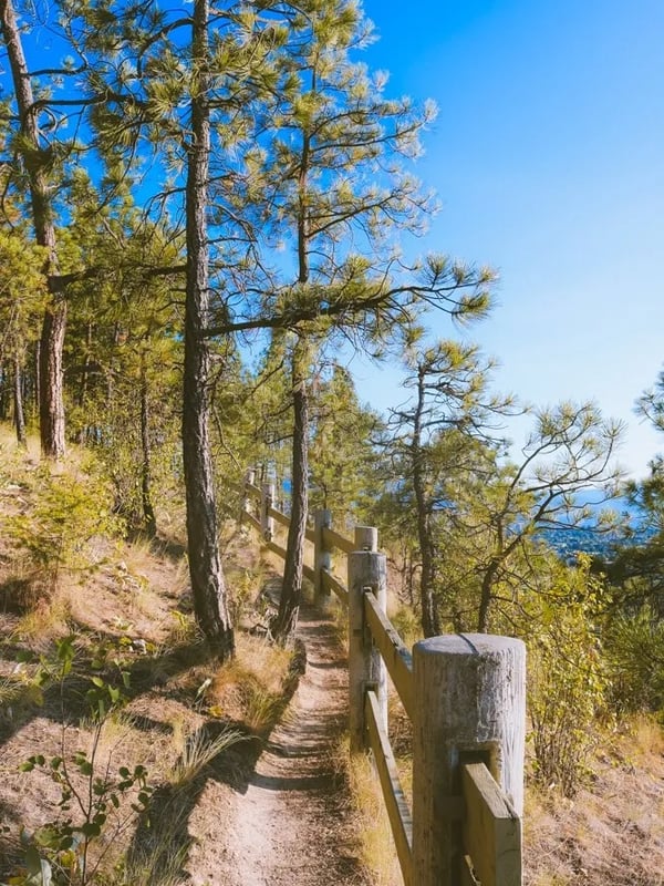 The main trail loops along the edge of the mountain and offers spectacular views of Glenmore and Kelowna. There are steep cliffs and a fence winds along the edge of the mountain. The main trail doesn’t follow the edge the entire time but there’s another, smaller trail that does.