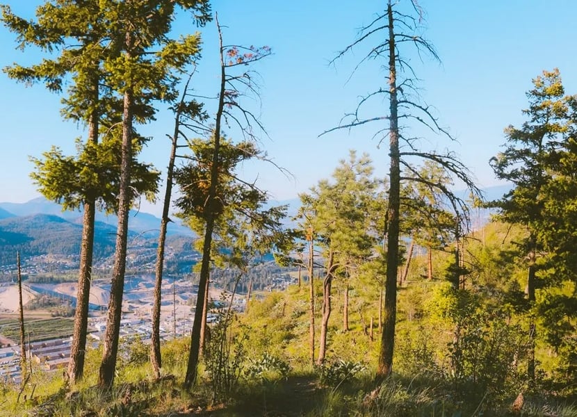 The trailhead for this hike starts at the Eain Lamont Park. You’ll hike on a large, well-worn trail as it meanders slowly along the base of Mt Boucherie, steadily climbing uphill until you reach a reservoir. From here, numerous smaller trails branch off and you’ll have to pick your adventure. No matter which trail you choose, you’ll have wonderful views and eventually make it to the top of Mt Boucherie.