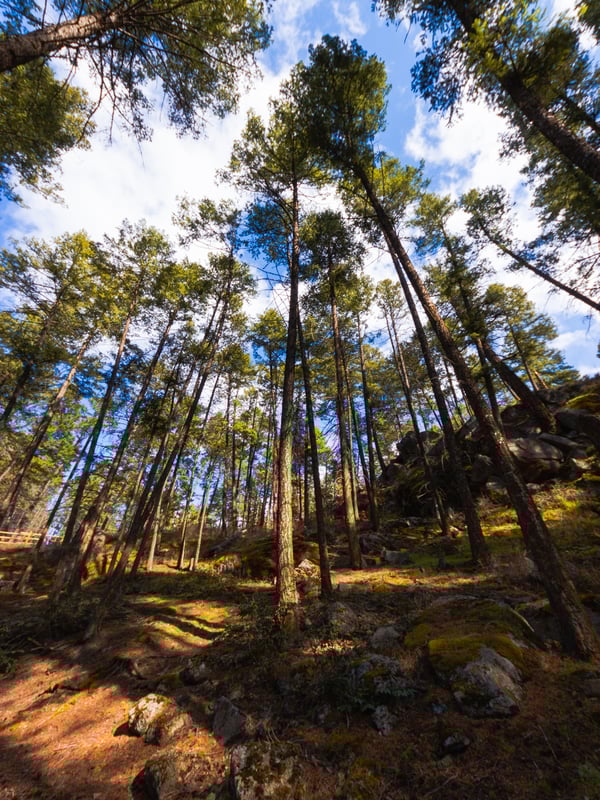 Mature Douglas firs and Ponderosa pines make up the majority of the tree cover at Ellison. Low underbrush covers the forest floor.