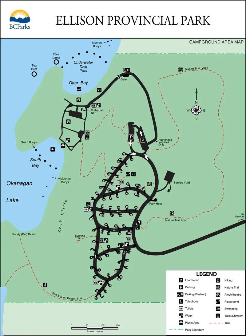 The Ellison Provincial Park campground is exclusively front-country camping. Backcountry and marine camping aren’t available, but you can moor a houseboat on the pet beach.