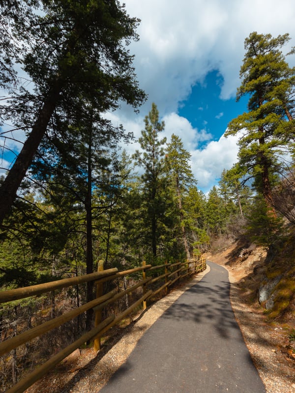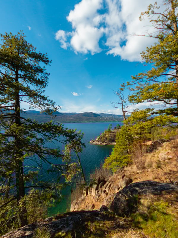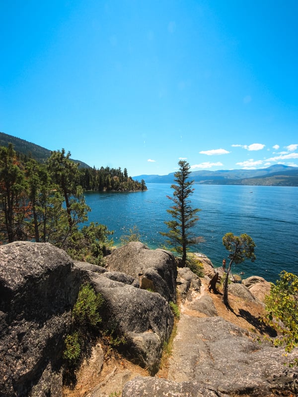 Beginning from the day-use parking lot or information sign, you’ll hike up into the forest, eventually coming to a bluff overlooking Okanagan Lake. Spend some time here and take in the view!