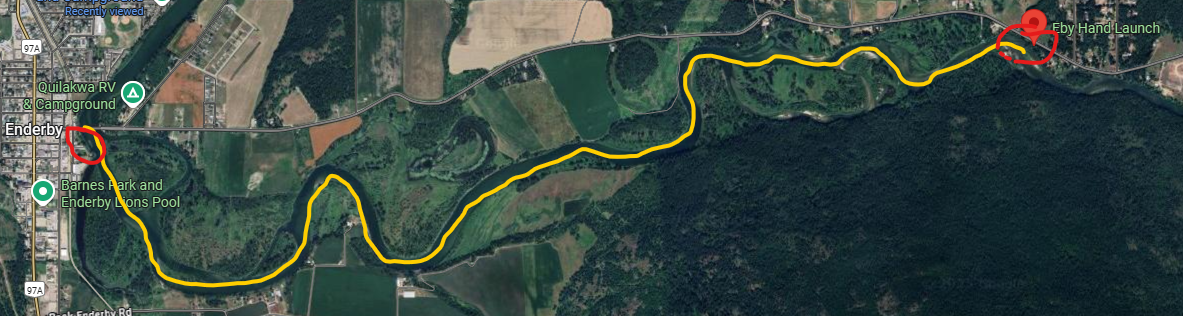 If it’s your first time doing the Enderby River float, this is the route I recommend. It’s about 2.5 km long and takes anywhere from 30 minutes in early summer to around two hours in late summer, depending on water levels.