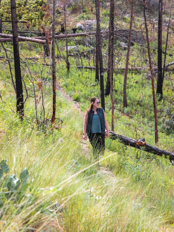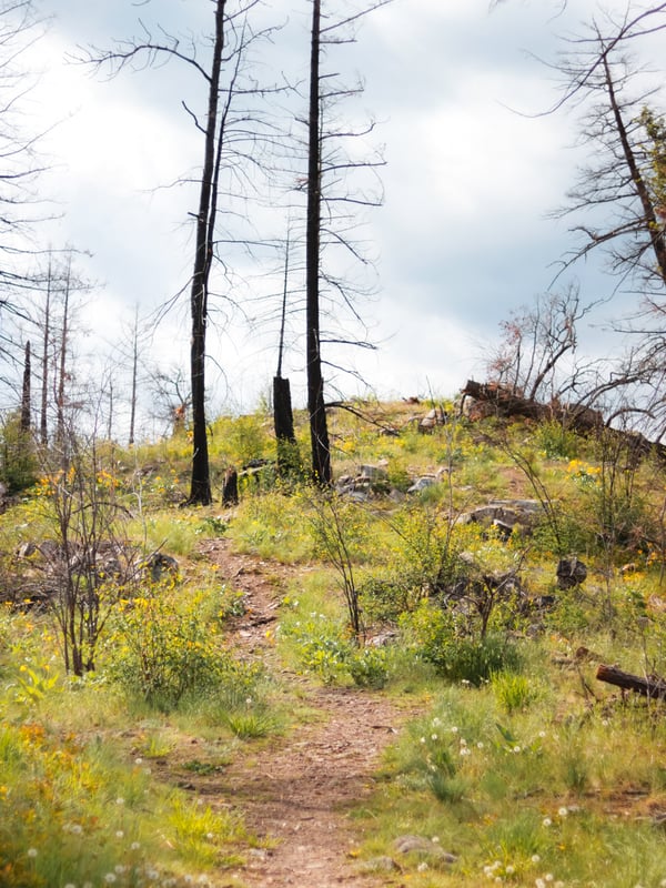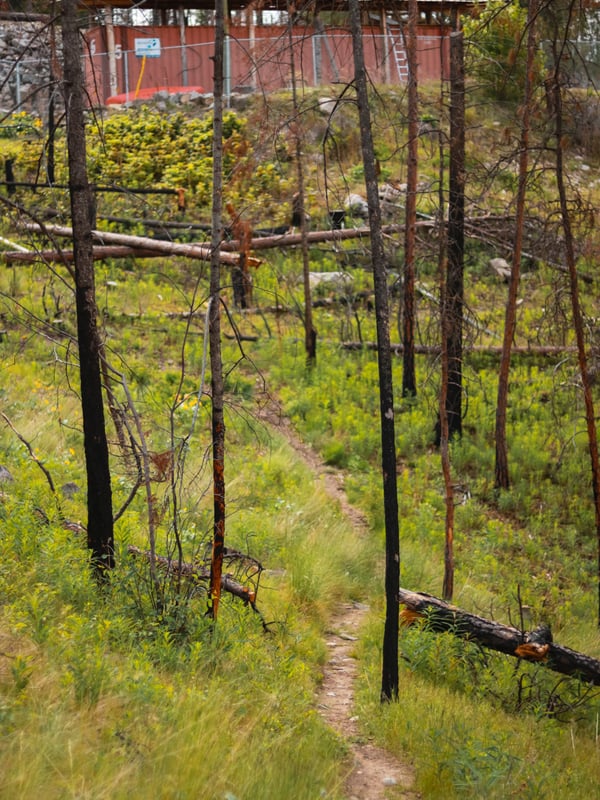 As for the trails themselves, they’re fairly easy and good for all experience levels. You’ll encounter spots that are narrow or have some elevation change, but the trails are hard-packed and clear of debris. The trails are also quite shaded thanks to the forest of Ponderosa Pines, so even on really hot days, you won’t be baking in the sun! Just watch out for the viewpoints, because they’re quite a bit more exposed. You’ll even spot evidence of a fire, which, unfortunately, is pretty common in the Okanagan.
