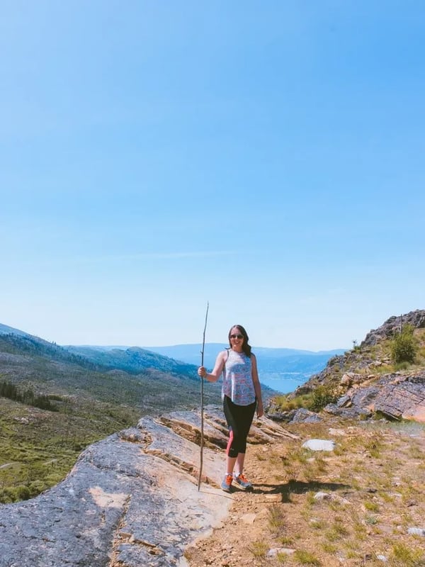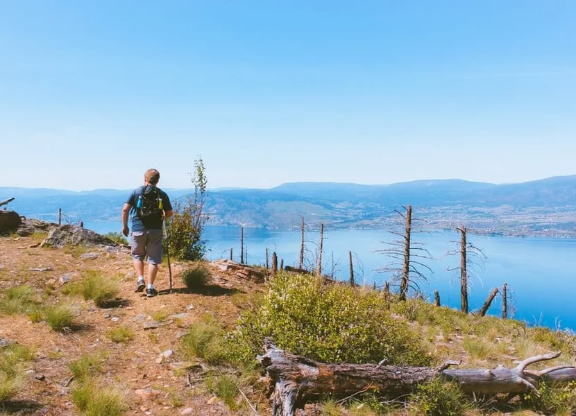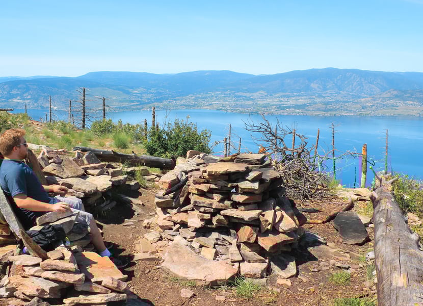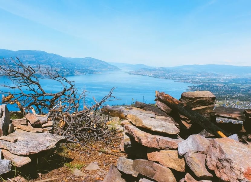It’s a barren, hot, and dry trail with a decent amount of elevation change. You’ll also enjoy great views of the Crag, Okanagan Lake, and the nearby homes.