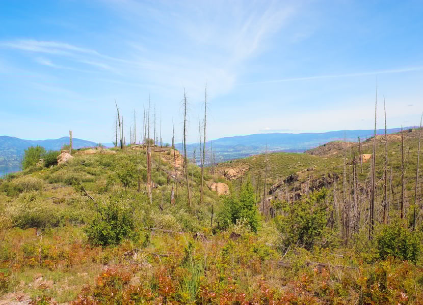 As you hike through the park, you’ll notice it’s hot and barren, covered in burnt trees. Wondering what happened? Well, back in August 2003, a bolt of lighting started a devastating fire on Okanagan Mountain. The rampant wildfire quickly spread and burned over 25,000 hectares of forest near Kelowna. Over 27,000 people were evacuated and it continued to burn for weeks.