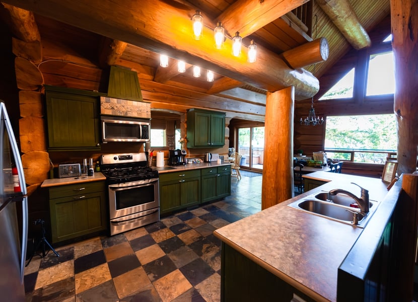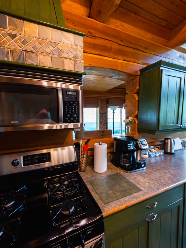 You’ll have no trouble whipping up delicious meals – whatever you can dream up, you can make here! The kitchen is open concept, so everyone can easily get involved while enjoying the stunning mountain and lake views out the large front windows. There’s also an opening between the kitchen and sunroom that makes it easy to chat back and forth.