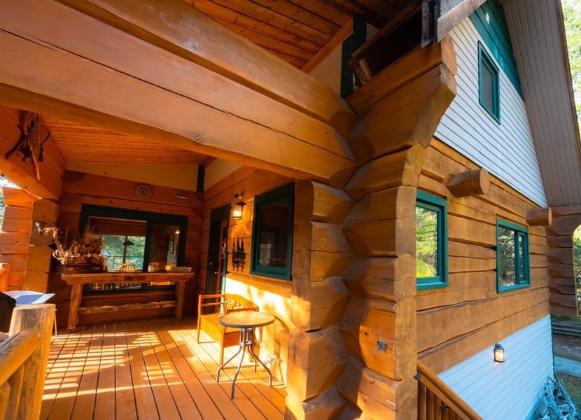 The log cabin is set back from the road. You can see the road from the house, but very few people drive or walk by. Besides, most of the house’s windows are facing the lake, not the road. There’s ample parking in the front and stairs climb to the main level.