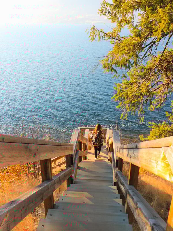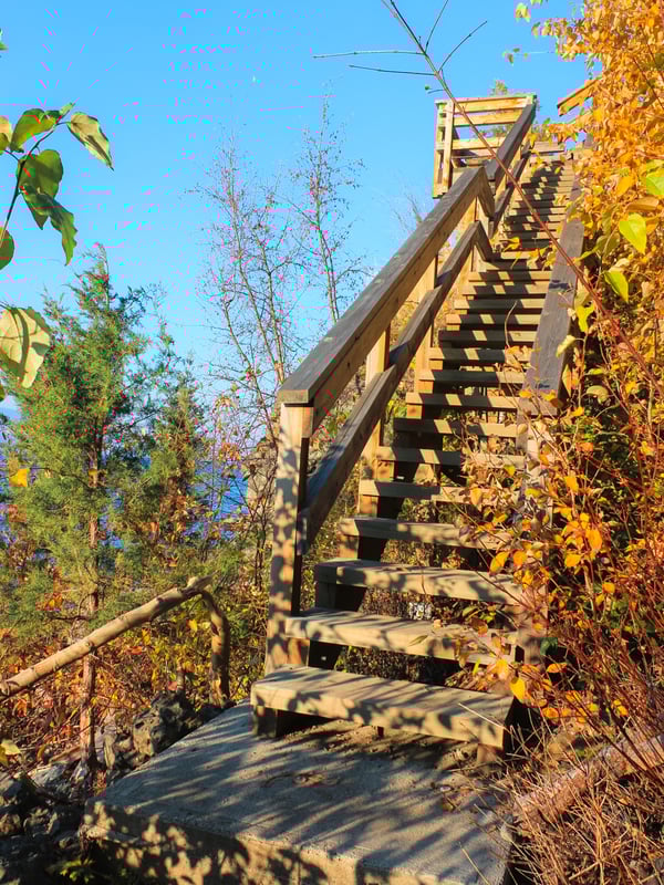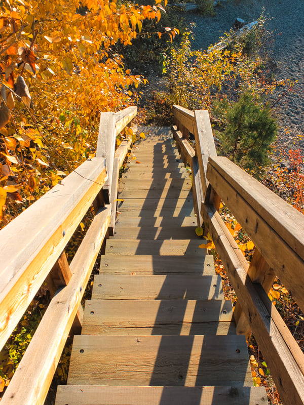The total elevation change is only 90 meters, but the many ups-and-downs along the way means you will be climbing much more than 90 meters! There are numerous timber crib stairs throughout, including one that gives you access to a small beach on the shore of Okanagan Lake.