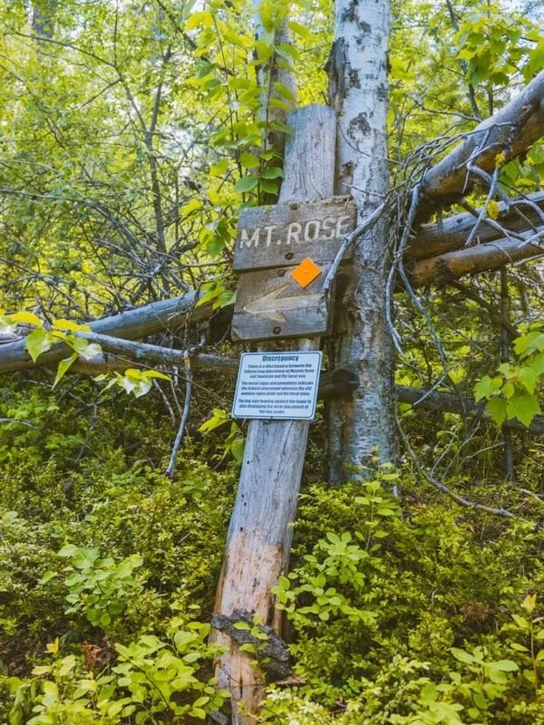 About 2 km in, you’ll come to a fork in the trail and some signs pointing you to the Mt Rose or Mt Swanson summits. You’ll learn all about the discrepancy in the summits here if you didn’t already know. Or, if you’re like me, you’ll suddenly realize there are two summits!
