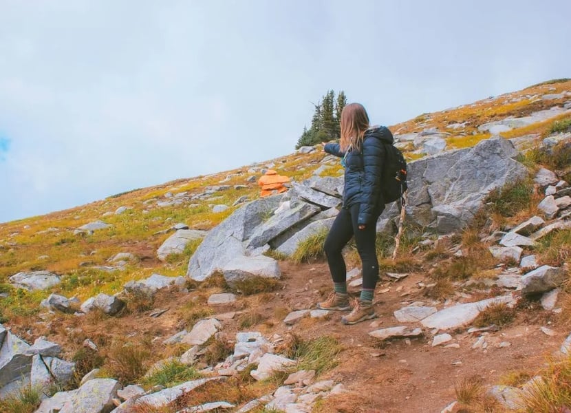 There are lots of small, flat rock beds along the trail here. The trail isn’t always obvious, so keep your eyes on the orange inukshuk to keep yourself from wandering off too far. As long as you head uphill and stay on the rocks, you’ll be fine.