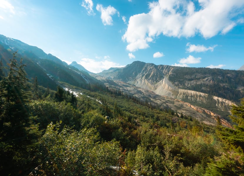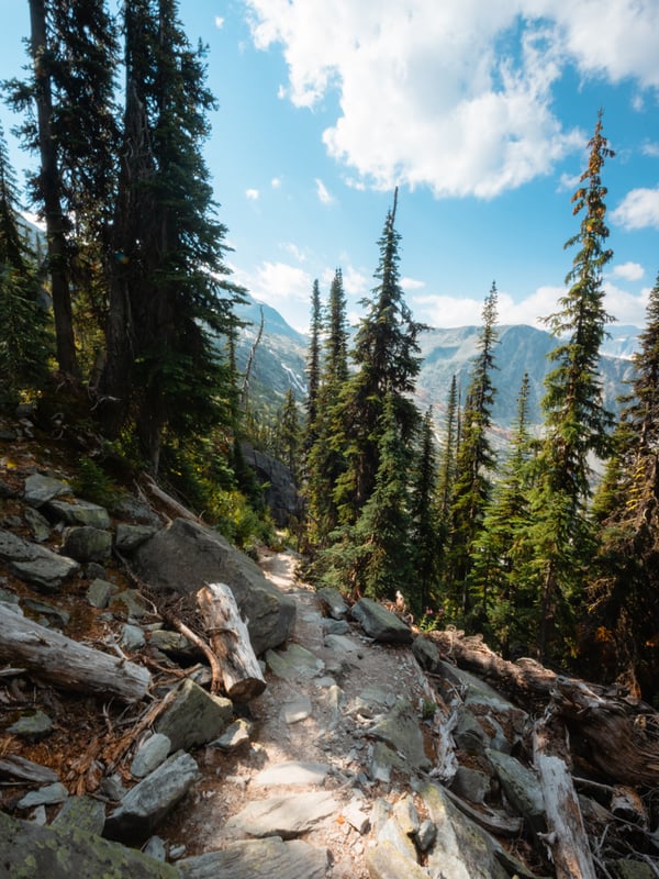 As you leave behind the second bridge, you’ll skirt the edge of the forest and catch glimpses of the landscape through the trees. You’ll enjoy stunning views of the surrounding mountains and waterfalls as Mount Sir Donald towers above you. It’s truly spectacular!