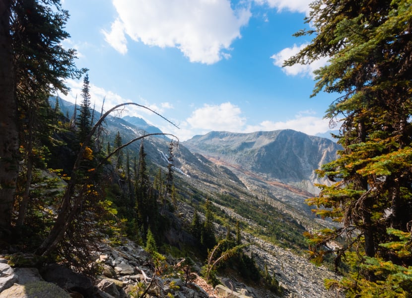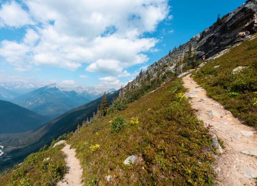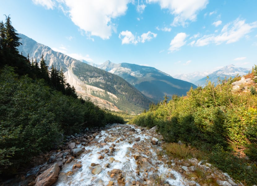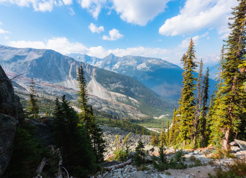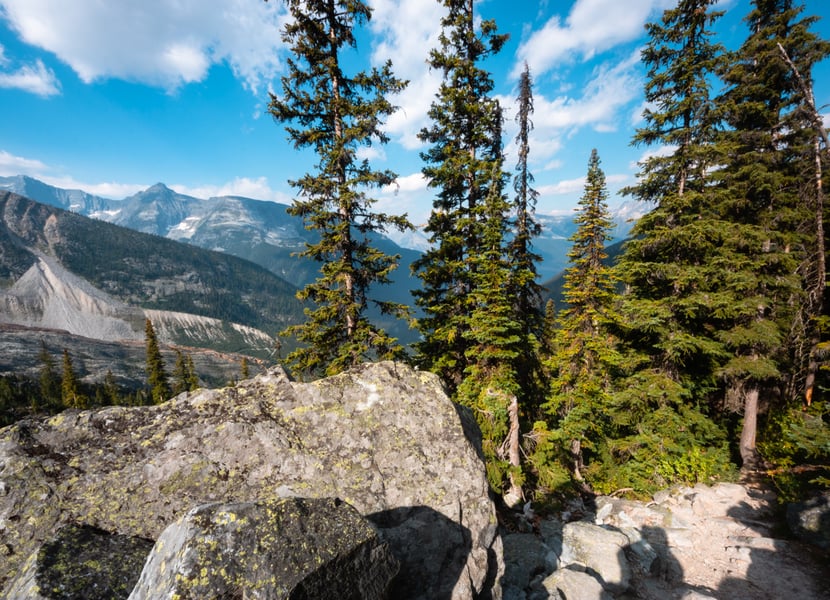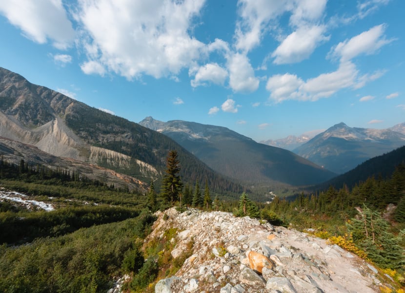 With so much elevation gain, the view gets better with every step. The valley sprawls at your feet and the mountains disappear in the distance. The Illecillewaet River snakes its way to the valley bottom and the glaciers are getting closer.