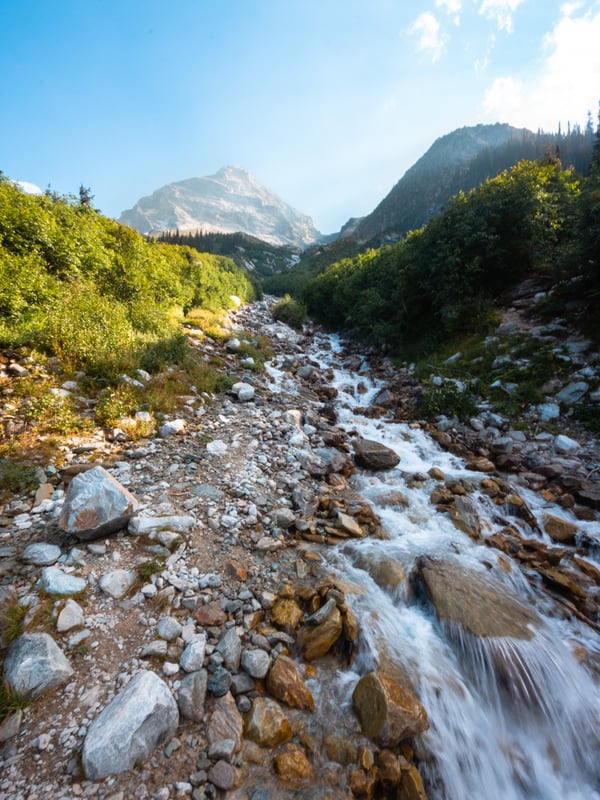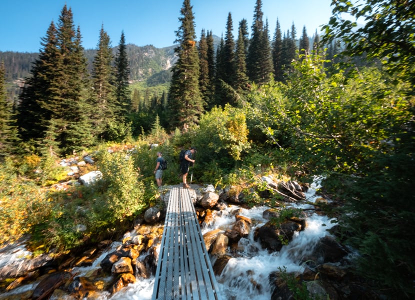As the forest thins, you’ll cross Vaux Creek on a small aluminum bridge and begin navigating an old avalanche path. It looks like a river of large rocks and is where an avalanche once thundered down the mountain.