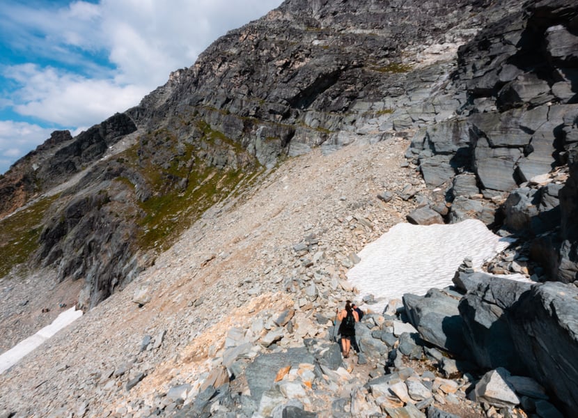 Once you’re past the sketchy snow wall section, you’ll follow the semi-worn trail up through the loose rock. The trail can be hard to see, but it’s pretty obvious where to go. Make your way to the ridge between two taller, rocky mounds. Go slow and soon you’ll reach the top!