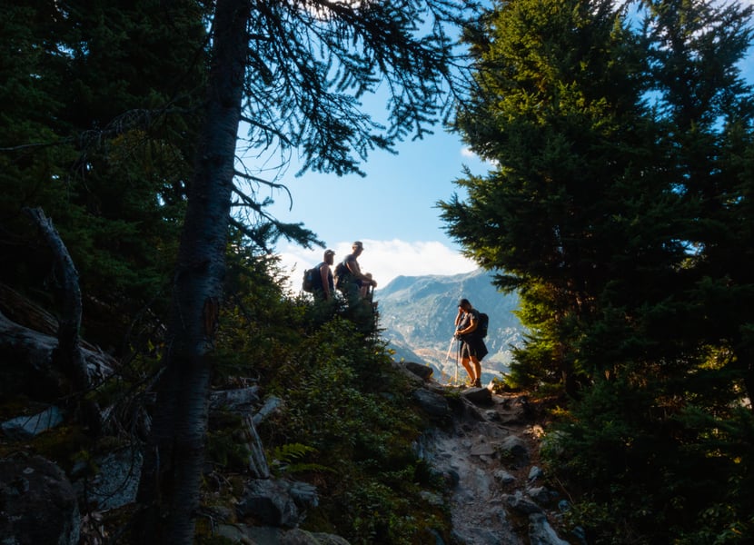 At around 1.5 km, the trail opens up into small alpine trees and you’ll get your first view of the mountain valley – and the looming peak you’re hiking to.