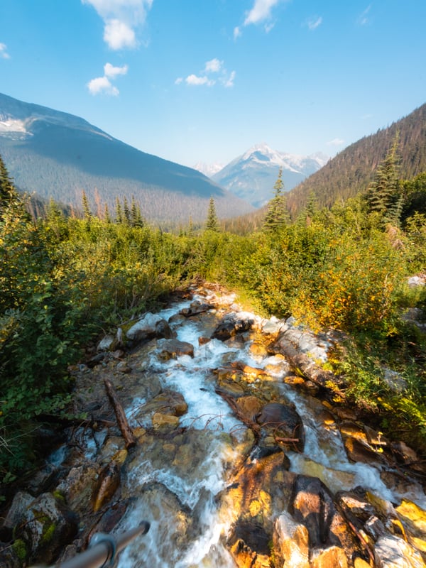 Meeting of the Waters is 50 minutes (65 km) from Revelstoke, just before the Rogers Pass Summit. It isn’t your typical waterfall — it’s the merge point of two small rivers and is more of a series of cascading falls than a grand waterfall. Regardless, it’s a nice walk through the forest with a small waterfall for payoff.