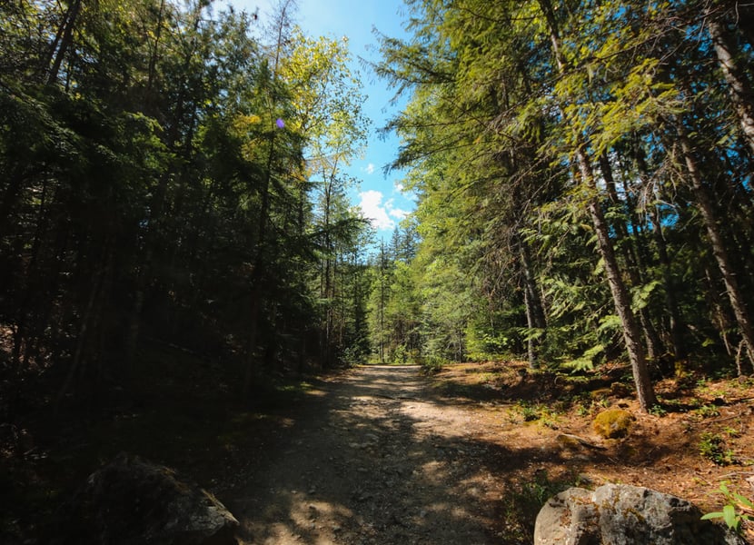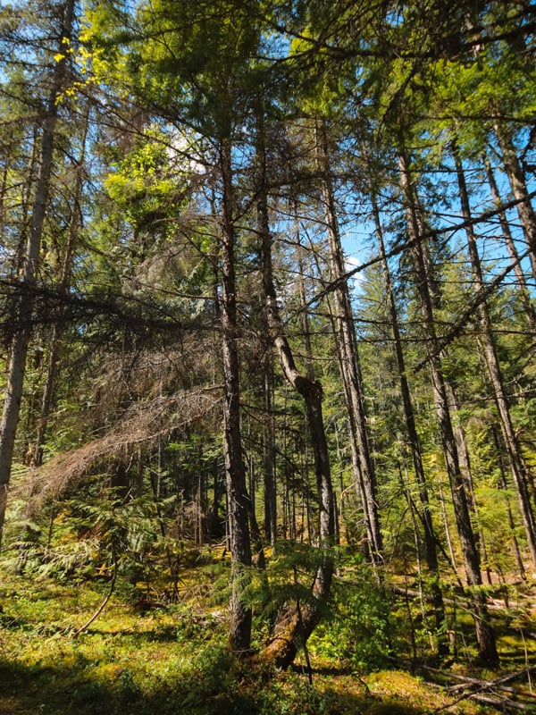 The Sutherlands Falls hike is an easy, mostly flat trail through a forest of white pine, western cedar, western hemlock, and moss. The trail follows Blanket Creek, but you can’t see the water until you reach the viewpoint.