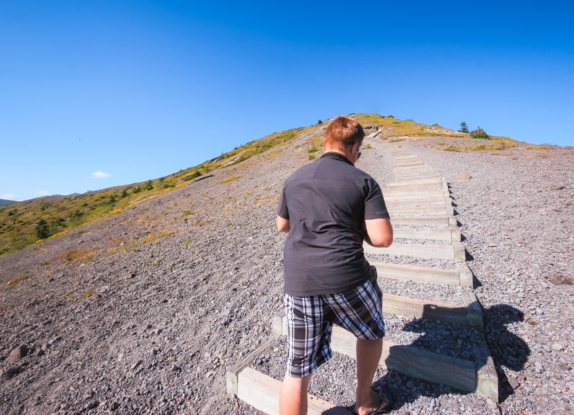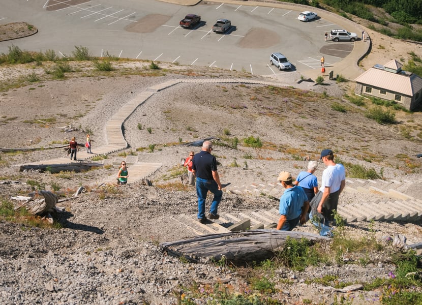 The sand ladder staircase at Windy Ridge Viewpoint has 368 steps. These steps are made of pumice gravel and are wide and awkward.