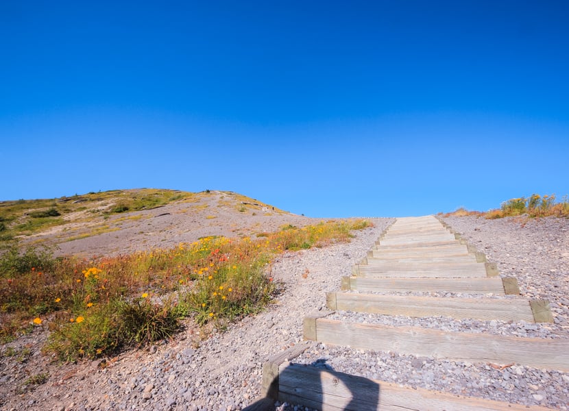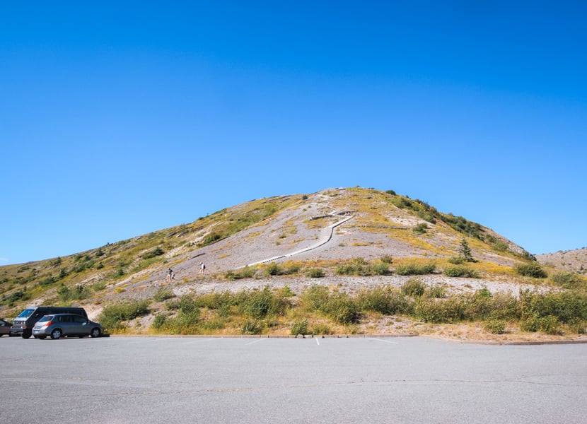 The Windy Ridge sand ladder, which is basically a staircase, is located just off the parking lot. You can’t miss it. The staircase makes the amazing views easily accessible, although it’s a tiring climb. The steps are mostly pumice gravel and the large stride makes the trail awkward. There are no trees on the hill, so you’ll be exposed to the wind and sun the entire time.